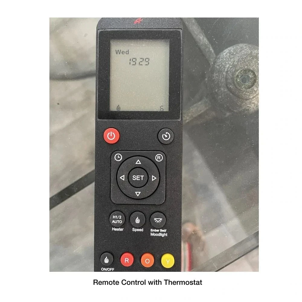 - Remote control included for flame and heater