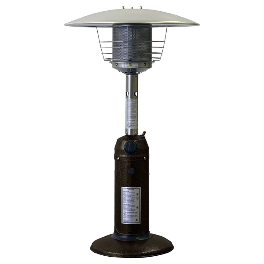 If you want to add just a little bit of warmth, the AZ Patio Heaters Hiland Hammered Bronze Tabletop Patio Heater is an excellent option. Just place this portable propane heater on a table to make everyone seated feel cozier. No assembly is required at all!