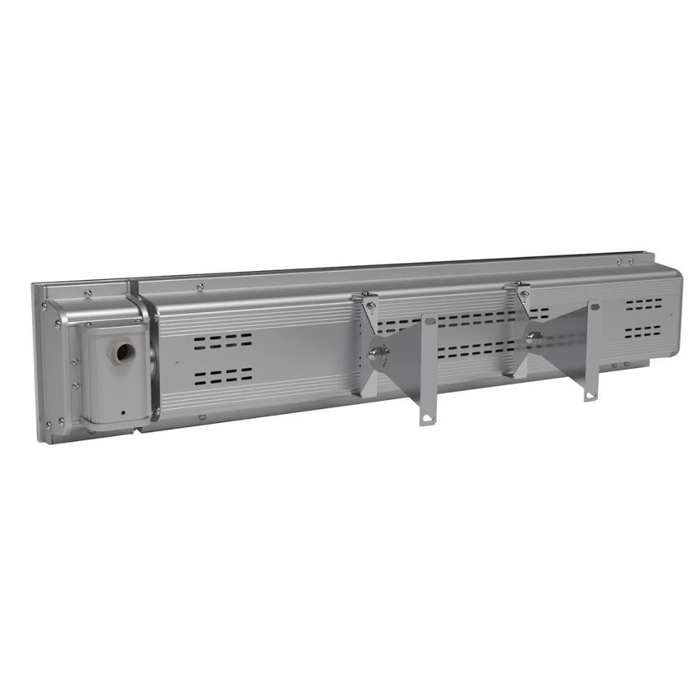 This 2200W infrared heater is hardwire-ready and mounted on the wall using the mounting kit that comes with the heater. Once mounted, adjust the angle of the heater to focus the heat in a particular area. It can warm an indoor space up to 99 sq ft and 60.3 sq ft for an outdoor area. The heat coverage is optimized in mild weather conditions where there are less breeze and moderate temperatures.