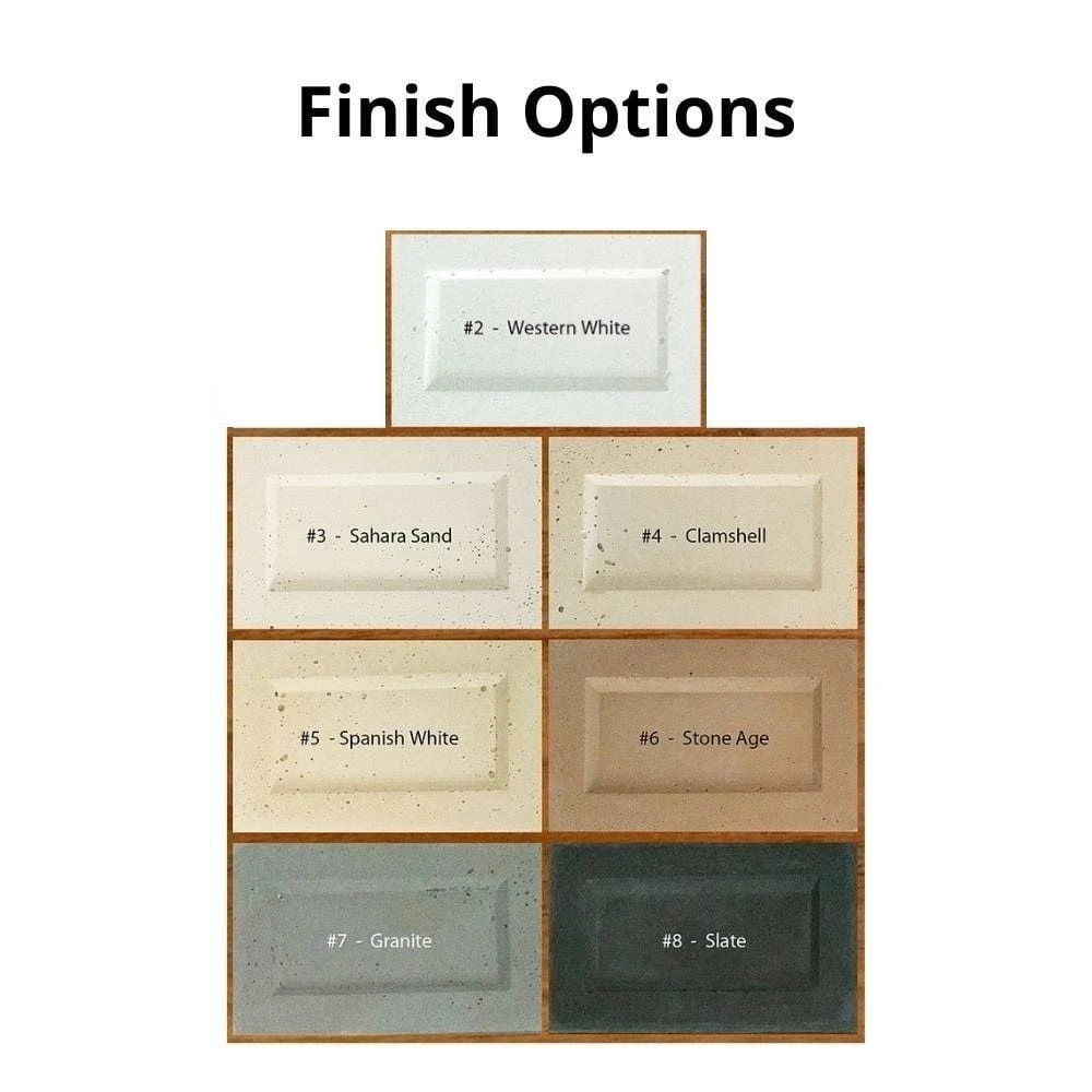 - 7 Finish Options to match your decor: Sahara Sand, Western White, Clamshell, Spanish White, Stone Age, Granite, and Slate