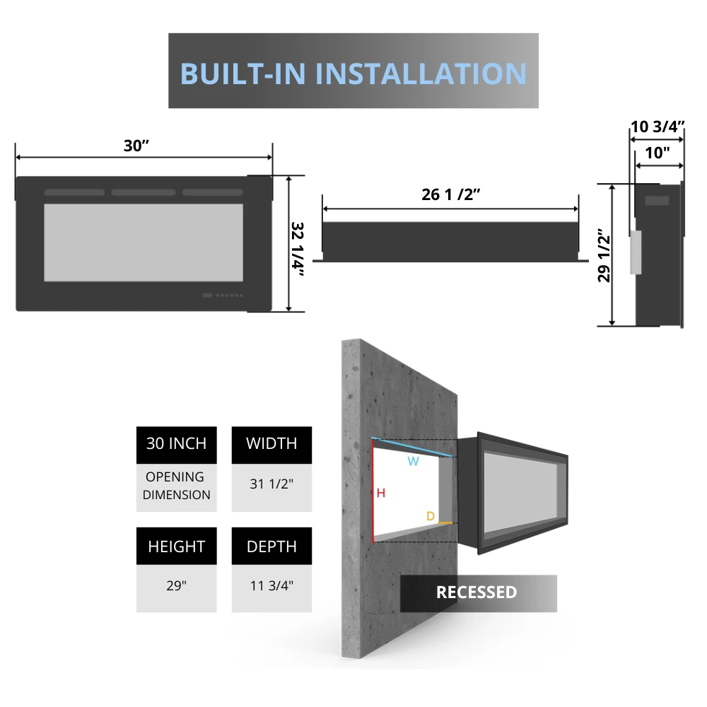 - A modern 30″ clean face electric fireplace with a real traditional log set and crystal ember bed that looks great in both a mantel or drywall installation