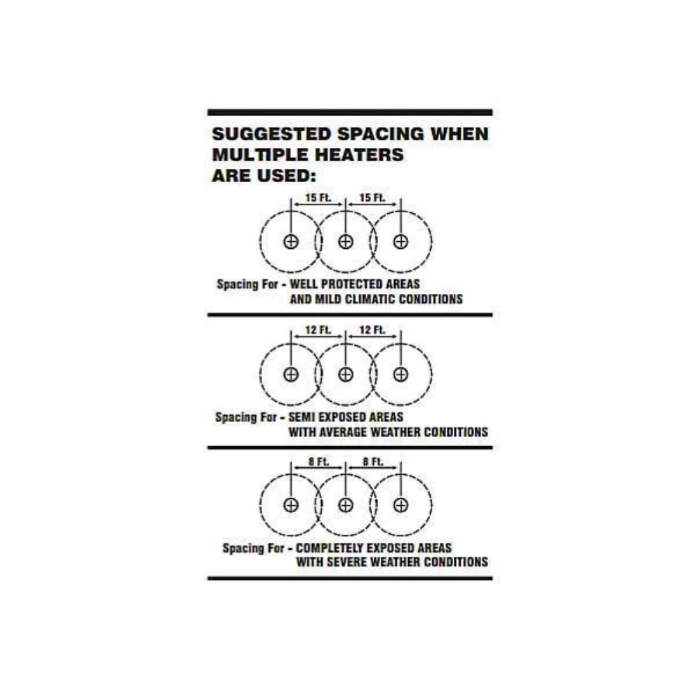 Spacing between these heaters should be 15 ft. apart for well-protected areas, 12 ft. apart. for semi-exposed areas, and 8 ft. apart for completely exposed areas with severe weather conditions.